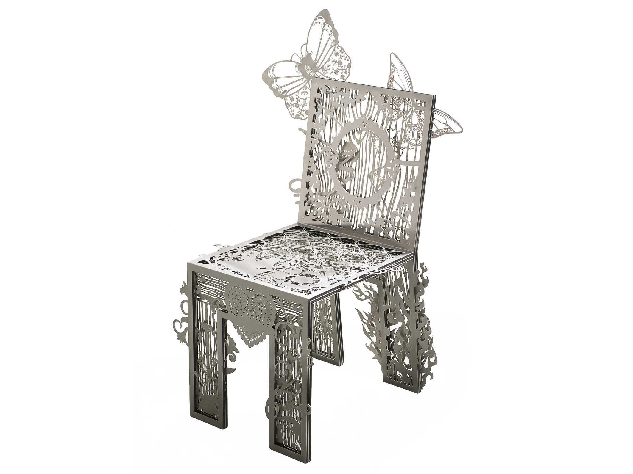 At first glance, the chair appears to be made from a combination of different materials such as wood, fabric, and upholstery. In reality, it is constructed from a single sheet of laser-cut stainless steel. Through highly detailed patterns, the surface mimics a variety of textures, creating the illusion of softness, layering, and even wear over time.